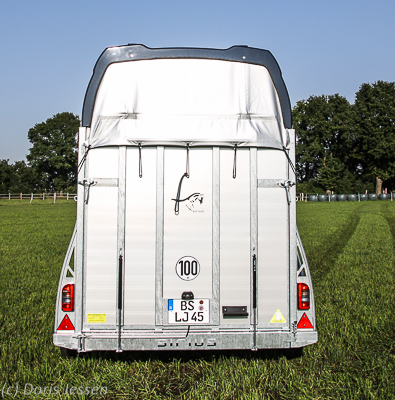 Das Heck wird durch zwei Aluminium-Seitenstreben stabilisiert, die auf Transportbodenhöhe mit einem Stahlblech verbunden sind. Hinter der Inspektions- bzw. Sattelkammertür verstärkt eine dritte Seitenstrebe aus schwarz pulverbeschichtetem Stahlblech den Aufbau zusätzlich. Darin befindet sich auch die Verschraubung der Bruststangen, deren äußere Öse zum Anbinden eines Pferdes dient. Im Notfall kann damit auch die Panikentriegelung von außen gelöst werden. Das zweite Pferd wird an einer entsprechenden Öse am Heck angebunden.