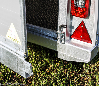 Die Heckklappe ist extrem stabil gebaut. Sie ist serienmäßig mit einfach bedienbarer Rampe-/Türfunktion ausgestattet. Leider fällt die Tür bei Wind oder schrägem Stand leicht ungewollt zu – ein passender Arretierungshaken muss extra bestellt werden. Das ist ein wenig ärgerlich, diente eine solch einfacher und sicherlich kostengünstiger doch nicht nur dem Komfort, sondern auch der Sicherheit, falls ein Pferd über den Stufeneinstieg verladen wird.