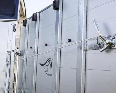 Wie in den meisten niederländischen Pferdeanhängern ist auch hier die Inspektionstür links und die Sattelkammertür rechts. Sie sind mit einer Dreipunktverriegelung und einem halbrund geformten Alugriff ausgestattet, der außen so eng anliegt, dass sich kein Strick darin verhaken kann. Sicher offen gehalten werden sie mit einem starken Magneten, der sein Gegenstück an der transportwand findet.