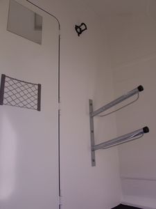 Der besondere Charme dieses Pferdeanhängers ist die begehbare, mannshohe beleuchtete Sattelkammer, die den gesamten Bugraum ausfüllt und wirklich für alles erdenkliche Pferdegepäck Platz bietet, nicht nur auf den Sattelhaltern und Trensenhaken, sondern natürlich auch auf der komfortabel geräumigen Stellfläche. Der Kosmetikspiegel an der Tür zum Transportraum erlaubt eine letzte Makeup-Überprüfung.