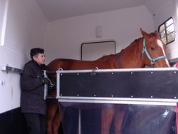 Etwas kniffliger wird es mit dem zweiten Pferd, das seine Kruppe nicht im Innenraum, sondern bereits auf der Rampe schräg hinten nach drehen muss, um die erforderliche Diagonalstellung einzunehmen.