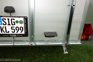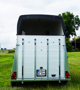 Die Heckriegel zum Verschließen sind leichtgängig und lassen sich komplett umklappen, sollte ein Pferd abrutschen, kann es sich nicht daran verletzen. In den beiden äußeren Streben liegen geschützt die Gasdruck-Rampenheber, die ein leichtes Öffnen und Schließen der Klappe garantieren. Alle Scharniere haben eigene Schmiernippel, um die dauerhafte Leichtgängigkeit der beweglichen Teile zu gewährleisten.