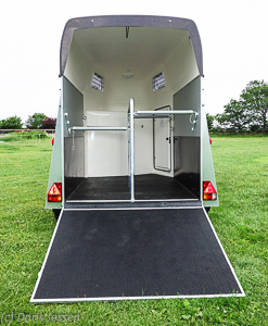 Die Alu-Heckklappe ist mit vier Stahlstreben und Rampenscharnieren sehr stabil, 160 cm lang und liegt daher angenehm flach auf. Die Pferde laufen gerne über den angenehm elastischen 10 Millimeter dicken „Supergrip-Boden“ aus Gummigranulat. Trittleisten sind hier nicht erforderlich, weil er sehr rutschfest ist. Er ist außerdem sehr leicht zu reinigen. Die Rampe ist mit einem verzinkten Stahlrahmen sauber eingefasst, eine robuste Schmutzschleuse sorgt dafür, dass die Scharniere sauber bleiben und sich keine Hufe oder Stollen zwischen Innenraumboden und Rampe verhaken können.