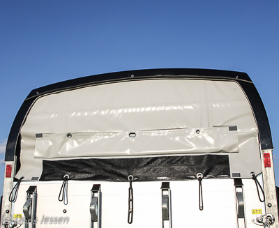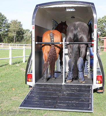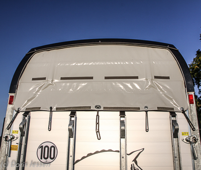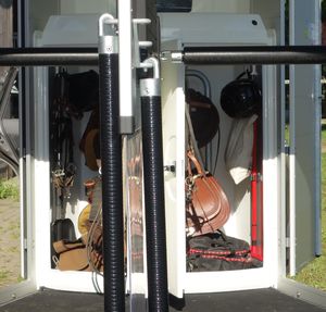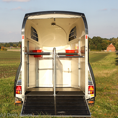 Kein Mangel herrscht an Anbindeösen, was sich vor allem auf Turnierparkplätzen als nützlich erweist. So finden wir vorne an den Einstiegstüren jeweils eine große Öse und am Heck zwei, die jeweils auch zum Öffnen der Panikentriegelung dienen. Zusätzlich kann auch durch die Öffnungen der Auflagen an den vier Heckstreben ein Strick bequem durchgezogen werden.