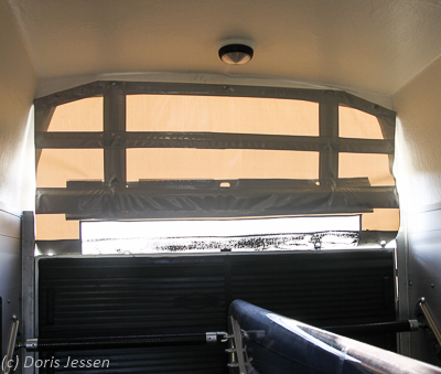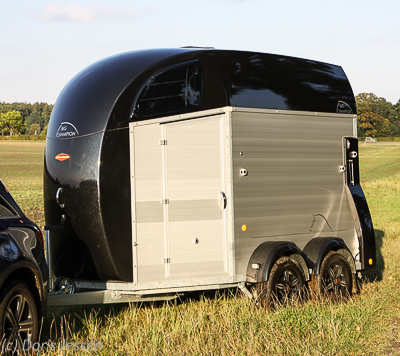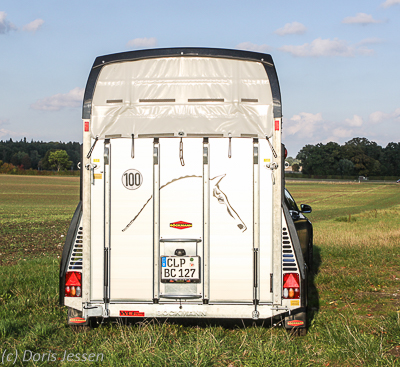 Auch das Handling für den Menschen, angefangen beim Aufhängen des Heunetzes über das Einladen und Anbinden der Vierbeiner bis hin zum Füttern zum Beispiel in Turnierpausen ist in dem großen Vorraum zwischen Bruststangen und Sattelkammer selbst für stärker gebaute Personen ohne Zwängen und Quetschen möglich. Ein wahrer Segen.