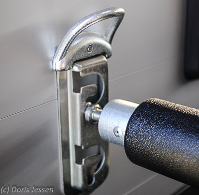 Wie an vielen anderen Details erkennt man auch hier, dass Böckmann stets die Sicherheit im Blick hat: Die hochglänzend verchromten Türgriffe liegen so eng an, dass sich kein Strick verfangen kann. Dies gilt auch für die innenliegenden Griffe. Sie sind alle mit demselben Schüssel abschließbar, der praktischerweise auch ins Kupplungsschloss passt.