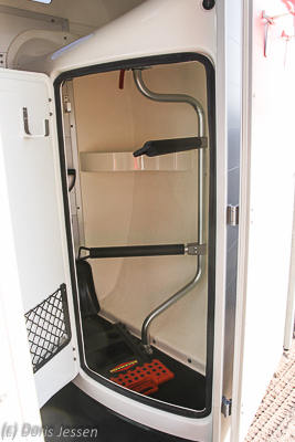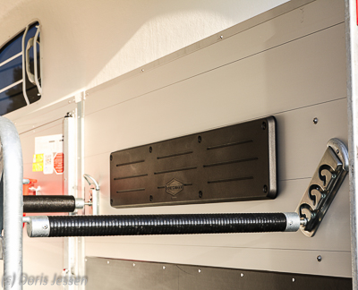 Neben dem Stauraum, ausreichend für Putzkästen oder -taschen, Sattel- und Abschwitzdecken, gibt es für Trensen und Helme ausreichend Haken, für Kleinkram Türnetze und im Bug Ablagen. Praktischerweise sind auch Besen und Schaufel und ein kleiner Falthocker dabei.