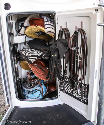 Der Aufbau mit zwei Einstiegstüren bedingt eine innenliegende Sattelkiste, die im Big Champion mit einem Sattelkarussell mit auszieh- und schwenkbaren Sattelhaltern bestückt ist. Die Kammer ist durch zwei Türen zugänglich. Je nach Geschmack ist die Kammer so von innen oder auch außenstehend durch die beiden mannshohen Inspektionstüren zu beladen. Kleinere Dressur- oder Vielseitigkeitssätteln lassen sich auch auf die nach außen geschwenkten Sattelhalter legen, große Westernsättel bleiben beim Zurückdrehen an der innenliegenden Ablage (die grundsätzlich sehr praktisch ist) hängen. Daher mussten bei uns die Halter also innen bleiben und die Sättel wie üblich von oben aufgelegt werden.