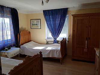 Die Ferienwohnung hat zwei Zimmer mit zwei bzw. drei Betten. Wenn noch mehr Gäste kommen wollen, bieten die Ertingshausens in der direkten Nachbarschaft weitere Unterbringungsmöglichkeiten. Die maximale Kapazität kann so auf zehn bis zwölf Personen erweitert werden.